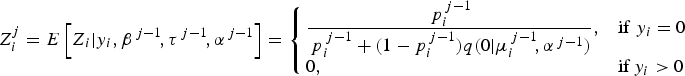 $$Z_i^j = E\left[ {Z_i \vert y_i, {\bi \beta} ^{\,j - 1}\!, \tau ^{\,j - 1}\!, \alpha ^{\,j - 1}} \right] = \left\{ {\matrix{ {\displaystyle{{\,p_i^{\,j - 1}} \over {\,p_i^{\,j - 1} + (1 - p_i^{\,j - 1} )q(0 \vert \mu _i^{\,j - 1}\!, \alpha ^{\,j - 1} )}},} \hfill & {{\rm if}\;y_i = 0} \hfill \cr {0,} \hfill & {{\rm if}\,y_i \gt 0} \hfill \cr}} \right.$$(2) M-step for β and α: Determine the estimates β j and α j by fitting the negative binomial regression model using the weights (