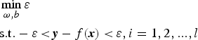 $$\eqalign{& \min _{\omega, b} \varepsilon \cr & {\rm s}{\rm. t}{\rm.}- \varepsilon \,{ \lt} \,{\bi y}-{ f}{\rm (}{\bi x}{\rm ) \lt} \,\varepsilon, i = 1,2,...,l} $$