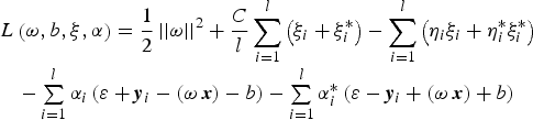 $$\matrix{ {L\left( {{\bi \omega}, b,\xi, \alpha} \right) = \displaystyle{1 \over 2}\left\vert {\left\vert {\bi \omega} \right\vert} \right\vert^2 + \displaystyle{C \over l}\mathop \sum \limits_{i = 1}^l \left( {\xi _i + \xi _i^*} \right) - \mathop \sum \limits_{i = 1}^l \left( {\eta _i \xi _i + \eta _i^* \xi _i^*} \right)} \cr { - \mathop \sum \limits_{i = 1}^l \alpha _i \left( {\varepsilon + {\bi y}_i - \left( {\omega \ {\bi x}} \right) - b} \right) - \mathop \sum \limits_{i = 1}^l \alpha _i^* \left( {\varepsilon - {\bi y}_i + \left( {\omega \ {\bi x}} \right) + b} \right)} \cr} $$