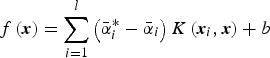 $$f\left( {\bi x} \right) = \mathop \sum \limits_{i = 1}^l \left( {\bar \alpha _i^* - \bar \alpha _i} \right)K\left( {{\bi x}_i, {\bi x}} \right) + b$$