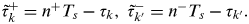 $\tilde \tau _k^ + = n^ + T_s - \tau _k, \;\tilde \tau _{k'}^ - = n^ - T_s - \tau _{k'}. $