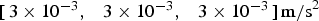 $\left[ {\matrix{ {3 \times {10}^{ - 3},} & {3 \times {10}^{ - 3},} & {3 \times {10}^{ - 3}} \cr}} \right]{\rm m/}{\rm s}^2$