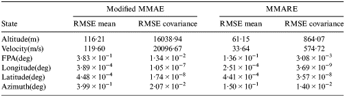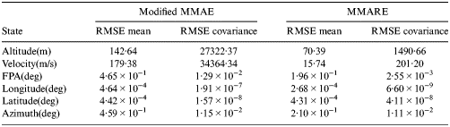 In addition, the mean and covariance of the estimators are calculated from the 500 independent trials and summarised in Table 6. From this Table, it is further found that the RMSE mean and covariance of the MMARE in FPA and azimuth are obviously smaller than those of the Modified MMAE, and the FPA and azimuth estimation accuracies of the MMARE are respectively increased by 64·49% and 62·41%. With respect to the altitude and velocity estimation accuracy which are important navigation indices, the altitude estimation RMSE of the MMARE reaches 61·15 m, and the estimation accuracy is increased by 47·38% compared with the Modified MMAE. Furthermore, the velocity estimation RMSE reaches 33·63 m/s, and the estimation accuracy is increased by 71·87%.