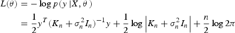 $$\eqalign{ L(\theta ) &= - \log p(y\left \vert {X,\theta} \right.) \cr & = \displaystyle{1 \over 2}{y^T}{({K_n} + \sigma _n^2 {I_n})^{ - 1}}y + \displaystyle{1 \over 2}\log \left \vert {{K_n} + \sigma _n^2 {I_n}} \right \vert + \displaystyle{n \over 2}\log 2\pi} $$Step 2 Get the partial derivative of L(θ) on θ as