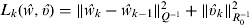 $L_k (\hat w,\hat \upsilon ) = \Vert \hat w_k - \hat w_{k - 1} \Vert _{Q^{ - 1}} ^2 + \Vert \hat \upsilon _k\Vert _{R_0^{ - 1}} ^2 $.