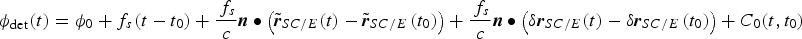 $$\eqalign{ \phi _{\det} (t) &= \phi _0 + f_s (t - t_0 ) + \displaystyle{{\,f_s} \over c}\sum\limits_{k = 1}^\infty {\displaystyle{{\left( {t - t_0} \right)^k} \over {k!}}} \left[ {{\bi n}^T {\bi A}_k \delta {\bi r}_{SC/E} \left( {t_0} \right) + {\bi n}^T {\bi B}_k \delta {\bi v}_{SC/E} \left( {t_0} \right)} \right] \cr & \quad + \displaystyle{{\,f_s} \over c}{\bi n} \bullet \left( {{\tilde {\bi r}}_{SC/E} (t) - {\tilde {\bi r}}_{SC/E} (t_0 )} \right) + C_0 (t,t_0 )} $$ Denoting