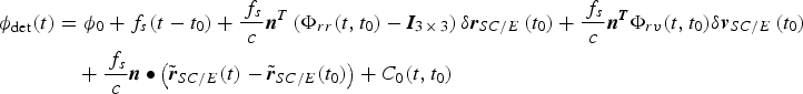 $$\eqalign{ \phi _{\det} (t) &= \phi _0 + f_s (t - t_0 ) + \displaystyle{{\,f_s} \over c}{\bi n}^T \left( {{\bi \Phi} _{rr} (t\comma t_0 ) - {\bi I}_{3\, \times\, 3}} \right)\delta {\bi r}_{SC/E} \left( {t_0} \right) + \displaystyle{{\,f_s} \over c}{\bi n}^{\bi T} {\bi \Phi} _{rv} (t\comma t_0 )\delta {\bi v}_{SC/E} \left( {t_0} \right) \cr & \quad + \displaystyle{{\,f_s} \over c}{\bi n} \bullet \left( {{\tilde {\bi r}}_{SC/E} (t) - {\tilde {\bi r}}_{SC/E} (t_0 )} \right) + C_0 (t,t_0 )} $$Substituting Equations (A9) and (A10) into Equation (26) yields