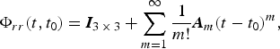 $${\bi \Phi} _{rr} (t,t_0 ) = {\bi I}_{3 \,\times\, 3} + \sum\limits_{m = 1}^\infty {\displaystyle{1 \over {m!}}{\bi A}_m (t - t_0 )^m,} $$