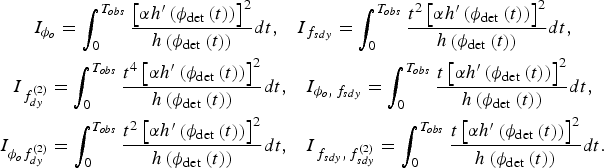 $$\displaylines{I_{\phi _o} = \int_0^{T_{obs}} {\displaystyle{{\left[ {\alpha h^{\prime}\left( {\phi _{\det} \left( t \right)} \right)} \right]^2} \over {h\left( {\phi _{\det} \left( t \right)} \right)}}dt,\quad} I_{\,f_{sdy}} = \int_0^{T_{obs}} {\displaystyle{{t^2 \left[ {\alpha h^{\prime}\left( {\phi _{\det} \left( t \right)} \right)} \right]^2} \over {h\left( {\phi _{\det} \left( t \right)} \right)}}dt,} \cr I_{\,f_{dy}^{(2)}} = \int_0^{T_{obs}} {\displaystyle{{t^4 \left[ {\alpha h^{\prime}\left( {\phi _{\det} \left( t \right)} \right)} \right]^2} \over {h\left( {\phi _{\det} \left( t \right)} \right)}}dt,} \quad I_{\phi _o\comma\, f_{sdy}} = \int_0^{T_{obs}} {\displaystyle{{t\left[ {\alpha h^{\prime}\left( {\phi _{\det} \left( t \right)} \right)} \right]^2} \over {h\left( {\phi _{\det} \left( t \right)} \right)}}dt,} \cr I_{\phi _o f_{dy}^{(2)}} = \int_0^{T_{obs}} {\displaystyle{{t^2 \left[ {\alpha h^{\prime}\left( {\phi _{\det} \left( t \right)} \right)} \right]^2} \over {h\left( {\phi _{\det} \left( t \right)} \right)}}dt,} \quad I_{\,f_{sdy}\comma\, f_{sdy}^{(2)}} = \int_0^{T_{obs}} {\displaystyle{{t\left[ {\alpha h^{\prime}\left( {\phi _{\det} \left( t \right)} \right)} \right]^2} \over {h\left( {\phi _{\det} \left( t \right)} \right)}}dt.}} $$Lemma 1 is merely an improvement of Theorem 4·2 in (Emadzadeh and Speyer, Reference Emadzadeh and Speyer2011), so the proof is omitted.