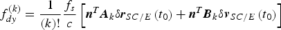 $f_{dy}^{(k)} = \displaystyle{1 \over {\left( k \right)!}}\displaystyle{{f_s} \over c}\left[ {{\bi n}^T {\bi A}_k \delta {\bi r}_{SC/E} \left( {t_0} \right) + {\bi n}^T {\bi B}_k \delta {\bi v}_{SC/E} \left( {t_0} \right)} \right]$, Equation (27) can be rewritten as