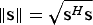 $\left\Vert {\bf s} \right\Vert = \sqrt {{\bf s}^H {\bf s}} $ . sH is the conjugate transpose of s. ||s|| is the absolute value of vector s.
