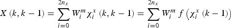 $${X}\left( {k,k - 1} \right) = \sum\limits_{i = 0}^{2n_x} {W_i^m \chi _i^x \left( {k,k - 1} \right)} = \sum\limits_{i = 0}^{2n_x} {W_i^m {\,f}\left( {\chi _i^x \left( {k - 1} \right)} \right)} $$(26)