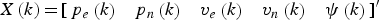 ${X}\left( k \right){\rm =} \left[ {\matrix{ {p_e \left( k \right)} & {p_n \left( k \right)} & {v_e \left( k \right)} & {v_n \left( k \right)} & {\psi \left( k \right)} \cr}} \right]^{\prime} $, the discretized state equation and measurement equation can be written as: