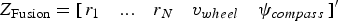 $$\eqalign{{Z}_{{\rm Fusion}} & = {h}_{{\rm Fusion}} \left[ {{X}_{{\rm Fusion}} \left( k \right)} \right] \cr & = \left[ {\matrix{ {\sqrt {\left( {\,p_e \left( k \right) - x_1 \left( k \right)} \right)^2 + \left( {\,p_n \left( k \right) - y_1 \left( k \right)} \right)^2} {\rm +} n_{r_1}} \cr {...} \cr {\sqrt {\left( {\,p_e \left( k \right) - x_N \left( k \right)} \right)^2 + \left( {\,p_n \left( k \right) - y_N \left( k \right)} \right)^2} {\rm +} n_{r_N}} \cr {v_e \left( k \right)\cos \psi \left( k \right) + v_n \left( k \right)\sin \psi \left( k \right) + n_v} \cr {\psi \left( k \right) + n_\psi} \cr}} \right]}$$
