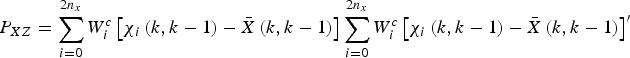 $$\eqalign{{P}\left( {k,k - 1} \right) & = \sum\limits_{i = 0}^{2n_x} {W_i^c} \left[ {\chi _i^x \left( {k,k - 1} \right) - {\bar X}\left( {k,k - 1} \right)} \right] \cr & \left[ {\chi _i^x \left( {k,k - 1} \right) - {\bar X}\left( {k,k - 1} \right)} \right]^{\prime} + {Q}\left( {k - 1} \right)}$$(27)