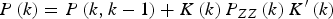 $${P}\left( k \right) = {P}\left( {k,k - 1} \right) + {K}\left( k \right){P}_{ZZ} \left( k \right){K^{\prime}}\left( k \right)$$