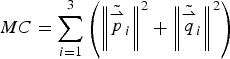 $MC = \sum\limits_{i = 1}^3 \left({\left\Vert{\tilde{\mathop {p}\limits^{\rightharpoonup}}_{i}}\right\Vert}^2 + {\left\Vert{\tilde{\mathop {q}\limits^{\rightharpoonup}}_{i}}\right\Vert}^2\right)$,  $MV = \sum\limits_{i = 1}^3 \left({\tilde{\mathop {p}\limits^{\rightharpoonup}}_{i}}^T R{\tilde{\mathop {q}\limits^{\rightharpoonup}}_{i}}\right) $, then