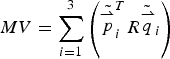 $$MV = \sum\limits_{i = 1}^3 \left[{\tilde{\mathop {\,p}\limits^{\rightharpoonup}}_{i}}^T R\,{\tilde{\mathop {q}\limits^{\rightharpoonup}}_{i}}\right] = \sum\limits_{i = 1}^3 \left[Trace\left({\tilde{\mathop {\,p}\limits^{\rightharpoonup}}_{i}} \ {{\tilde{\mathop {q}\limits^{\rightharpoonup}}_{i}}}^T R^T\right)\right]$$