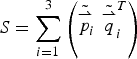 $S = \sum\limits_{i = 1}^3 \left({\tilde{\mathop {p}\limits^{\rightharpoonup}}\!_i} \,\,{{\tilde{\mathop {q}\limits^{\rightharpoonup}}_{i}}}^T\right) $, then