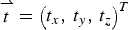$${\displaystyle{\partial T \left(\mathop {t}\limits^{\rightharpoonup} \comma\, R \right)} \over {\partial\, {\mathop {t}\limits^{\rightharpoonup}}}} = \left[ {\displaystyle{{\partial T} \over {\partial t_x}} \comma \displaystyle{{\partial T} \over {\partial t_y}} \comma \displaystyle{{\partial T} \over {\partial t_z}}} \right]^T$$