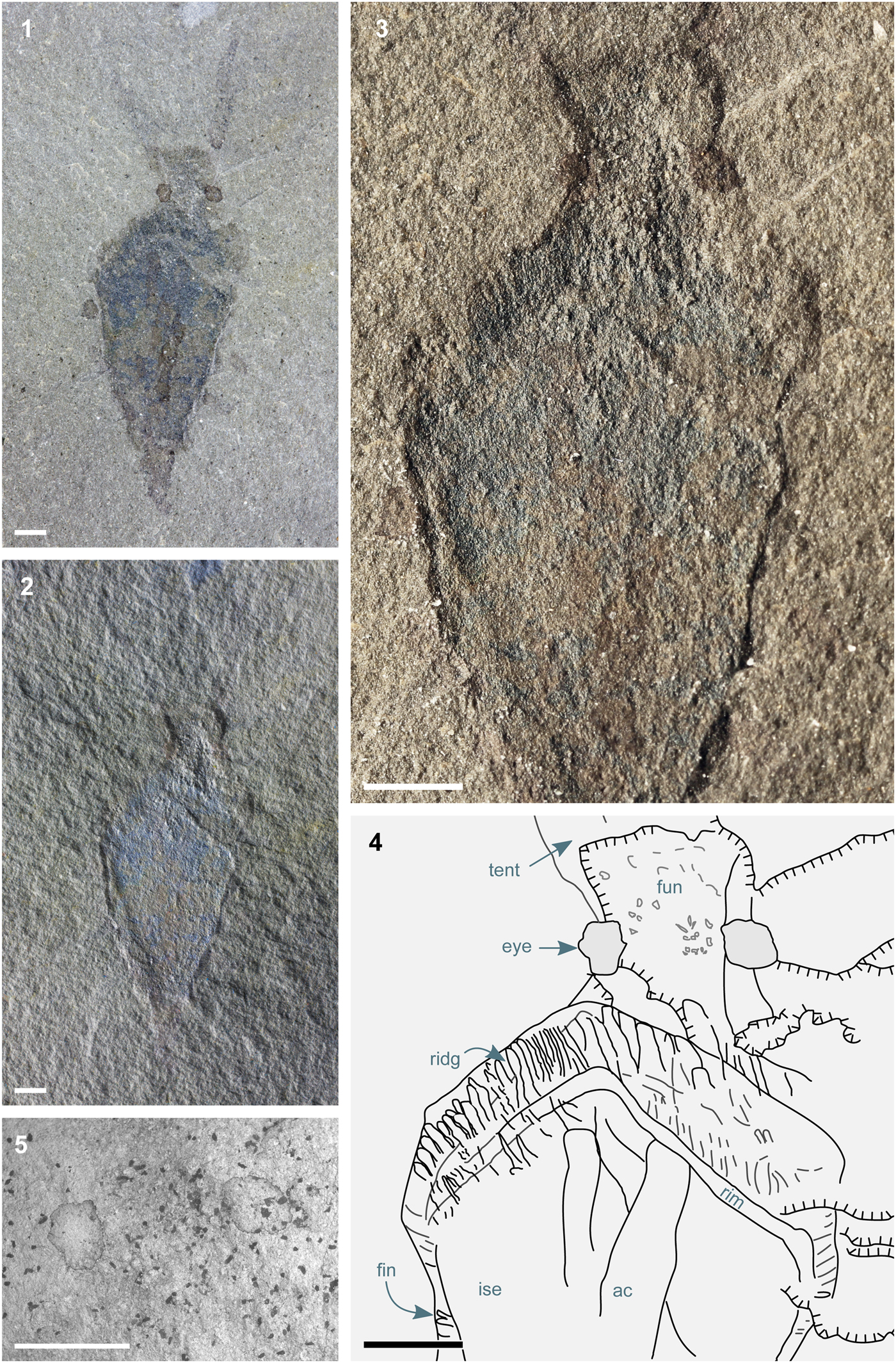 Figure 1. Nectocotis rusmithi n. gen. n. sp. (ROM IP 65341). (1) Dorsal surface of complete specimen, bright-field illumination, crossed polars; (2) dark-field illumination, relief emphasized using the Grain Extract algorithm (GNU Image Manipulation Program 2.10.10, www.gimp.org) to superimpose images taken under two opposite illumination directions; pixels assigned color values from bright-field image; (3) dark-field illumination; (4) sketch summarizing features visible under different lighting conditions; (5) scanning electron micrograph of head region, showing relief and distinct composition of eyes. High-resolution images are available at FigShare (Smith, Reference Smith2019). All scale bars represent 1 mm. Abbreviations: ac, decayed contents of axial cavity (gills?); fun, funnel; fin, fin; ise, internal skeletal element; ridg, ridges in fin; rim, rim of kite-shaped structure; tent, tentacle.