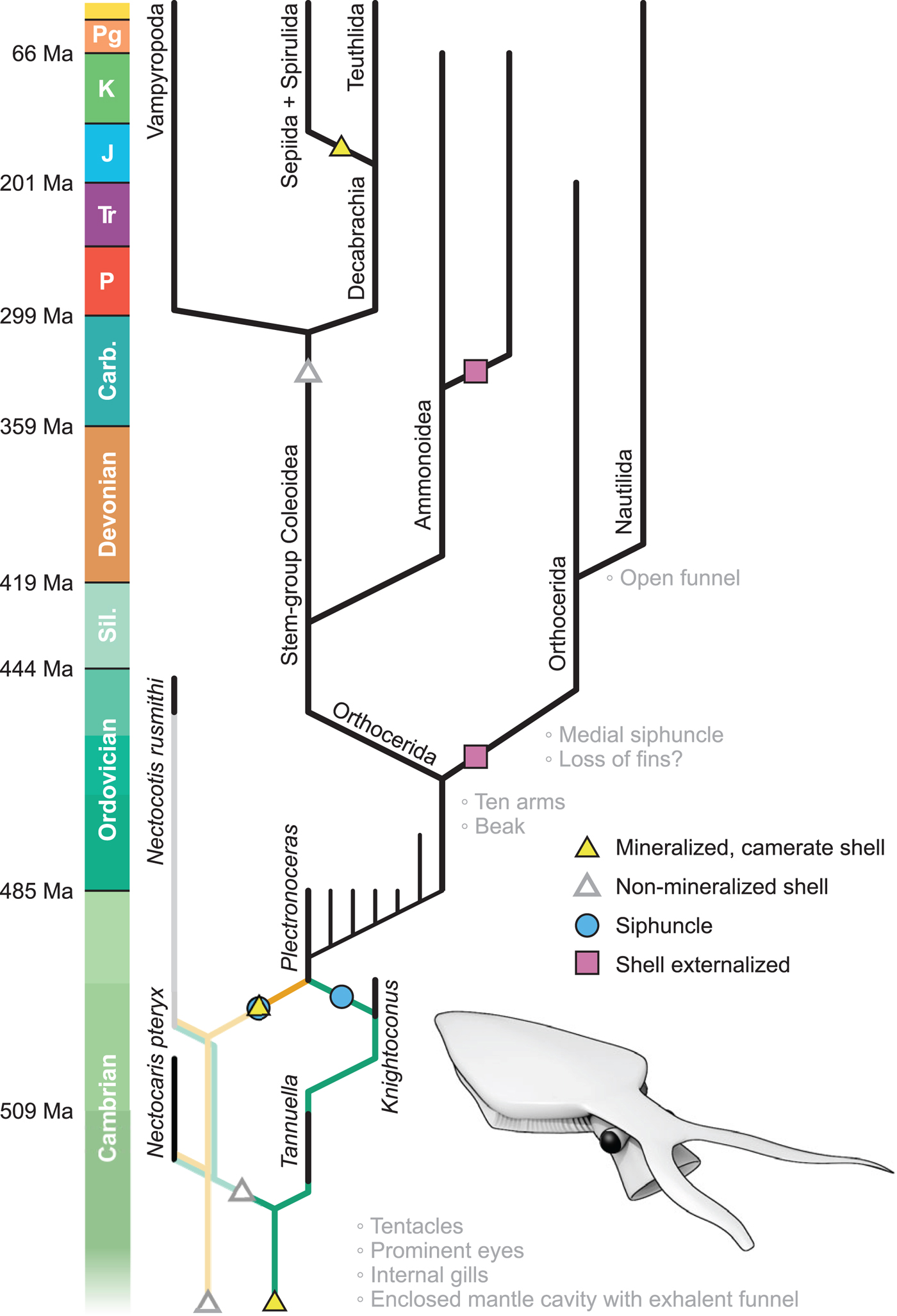 The oldest uncontroversial cephalopods are late Cambrian phragmocones—chambered shells in which adjacent chambers are connected by a siphuncular tube, which represents a cephalopod synapomorphy. The consensus view is that a shell was inherited from a molluscan common ancestor, with several chambered ‘monoplacophoran’ taxa (Yochelson et al., Reference Yochelson, Flower and Webers1973; Brock and Paterson, Reference Brock and Paterson2004) representing candidate intermediate forms. On this view, weakly mineralized skeletal apparatuses such as the coleoid gladius, pen, or pro-ostracum arose through the reduction of a robust mineralized shell, perhaps on multiple occasions, but no earlier than the Carboniferous (Kröger et al., Reference Kröger, Vinther and Fuchs2011; Doguzhaeva and Mapes, Reference Doguzhaeva and Mapes2015).