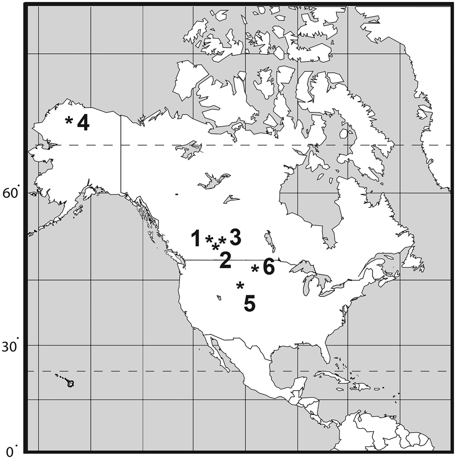 Figure 1. Map indicating distribution of Late Cretaceous Acipenseridae in North America. (1) Milk River Formation (Santonian–Campanian); (2) Judith River Group (middle–late Campanian); (3) Dinosaur Park Formation, late Campanian; (4) Prince Creek Formation (early Maastrichtian); (5) Lance Formation (late Maastrichtian); (6) Hell Creek Formation (late Maastrichtian).
