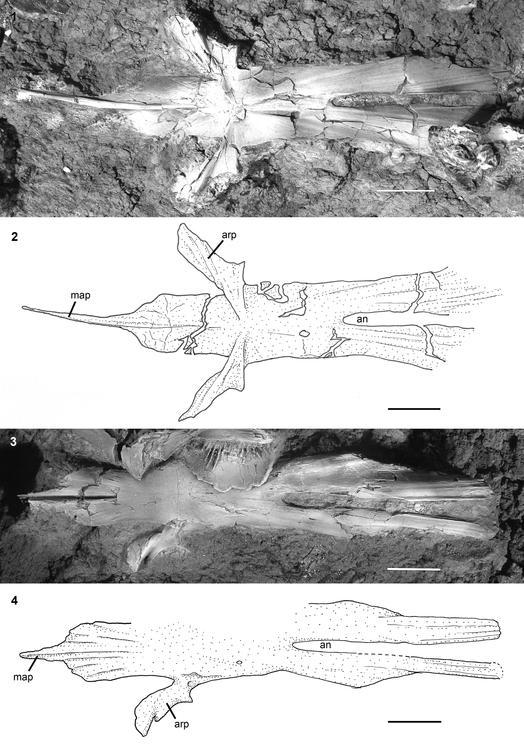 Figure 10. †Acipenser praeparatorum n. sp. isolated parasphenoid. (1) Photograph and (2) line drawing of parasphenoid in dorsal view (FMNH PF17622); (3) photograph and (4) line drawing of parasphenoid in ventral view (FMNH PF17623). Anterior facing left. Abbreviations: an, aortic notch; arp, ascending process of the parasphenoid; map, median anterior process of the parasphenoid. Scale bars = 2 cm.