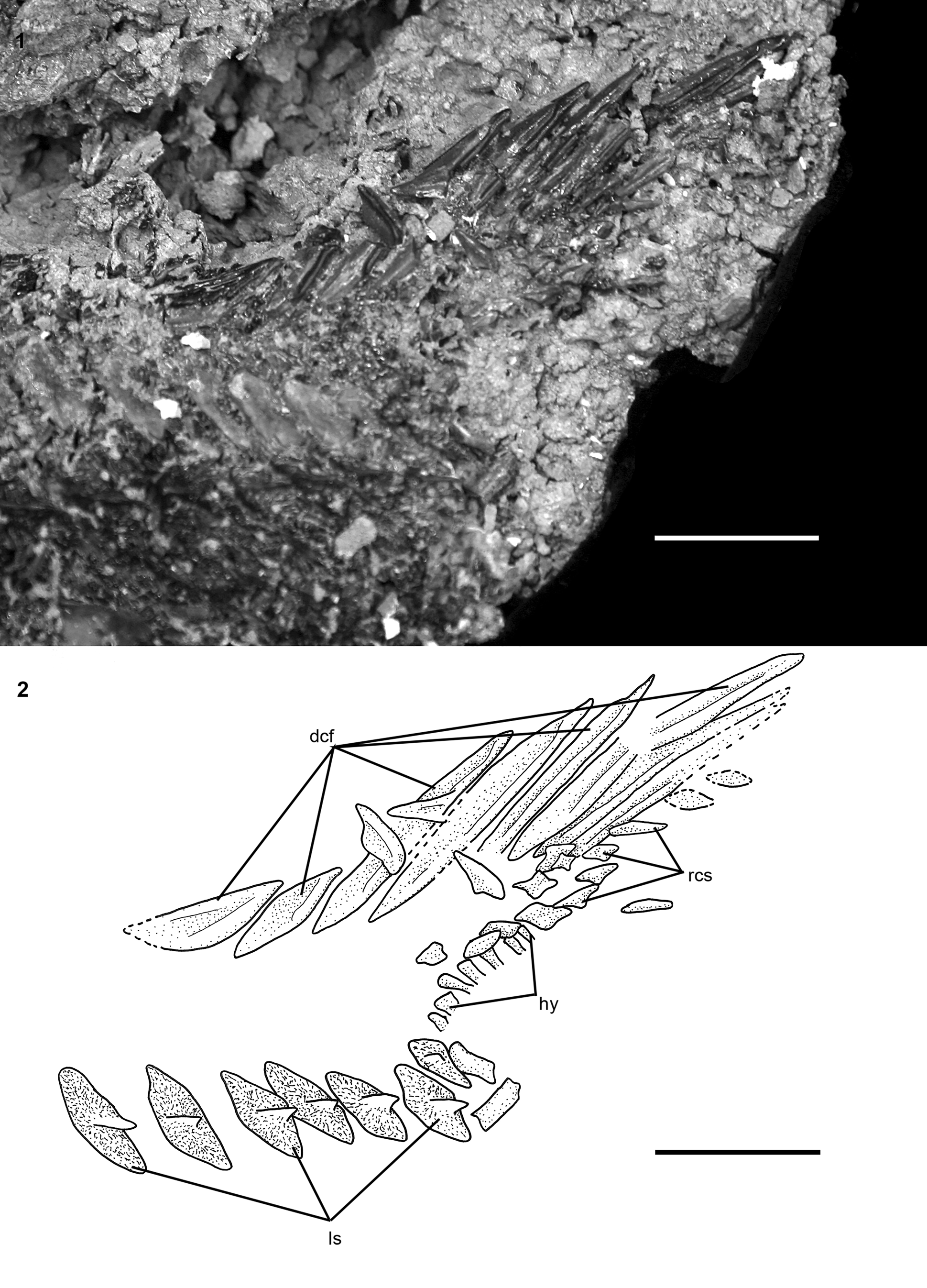 A few elements identified as gill arch bones are preserved (e.g., Figs. 5, 8, 9), but cannot be identified to series; two elements based on shape and position may represent ceratobranchials (Fig. 7). No gill rakers were found.