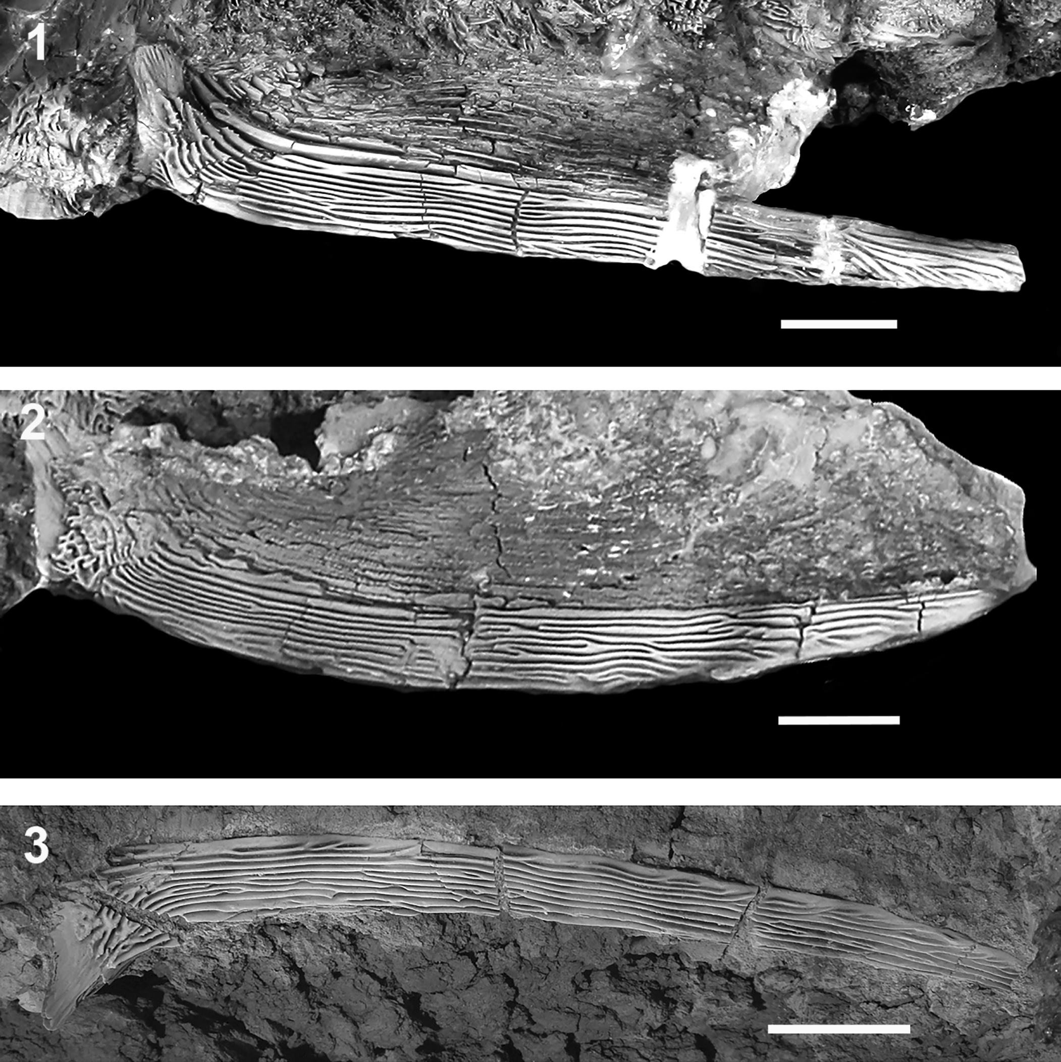 Figure 15. †Acipenser praeparatorum n. sp. pectoral fin spines. Photographs of (1) FMNH PF17608 (holotype), lateral view; (2) FMNH PF17607, lateral view; (3) FMNH PF17624, dorsal view. Anterior facing right (2), image reversed so anterior faces left). Scale bars = 2 cm.