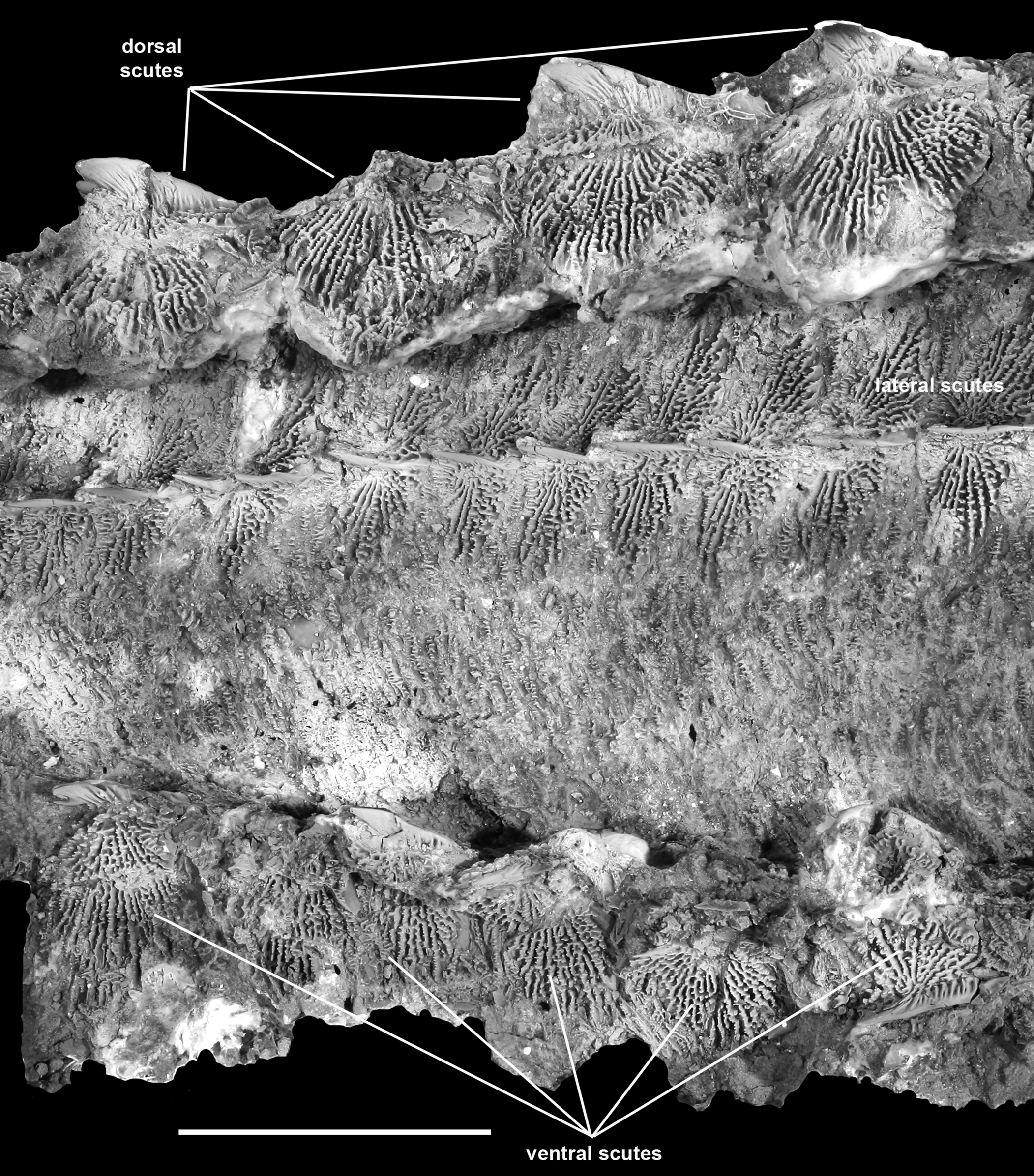 Body scales between the scutes (Fig. 16) are tall, overlapping, and irregularly shaped. These cover the body but are most densely packed between the lateral and ventral scute series. The scales are ornamented with horizontally arranged rows of small, tooth-like ornamentation, similar in form to the ornamentation on the posterior portions of the lateral scutes.