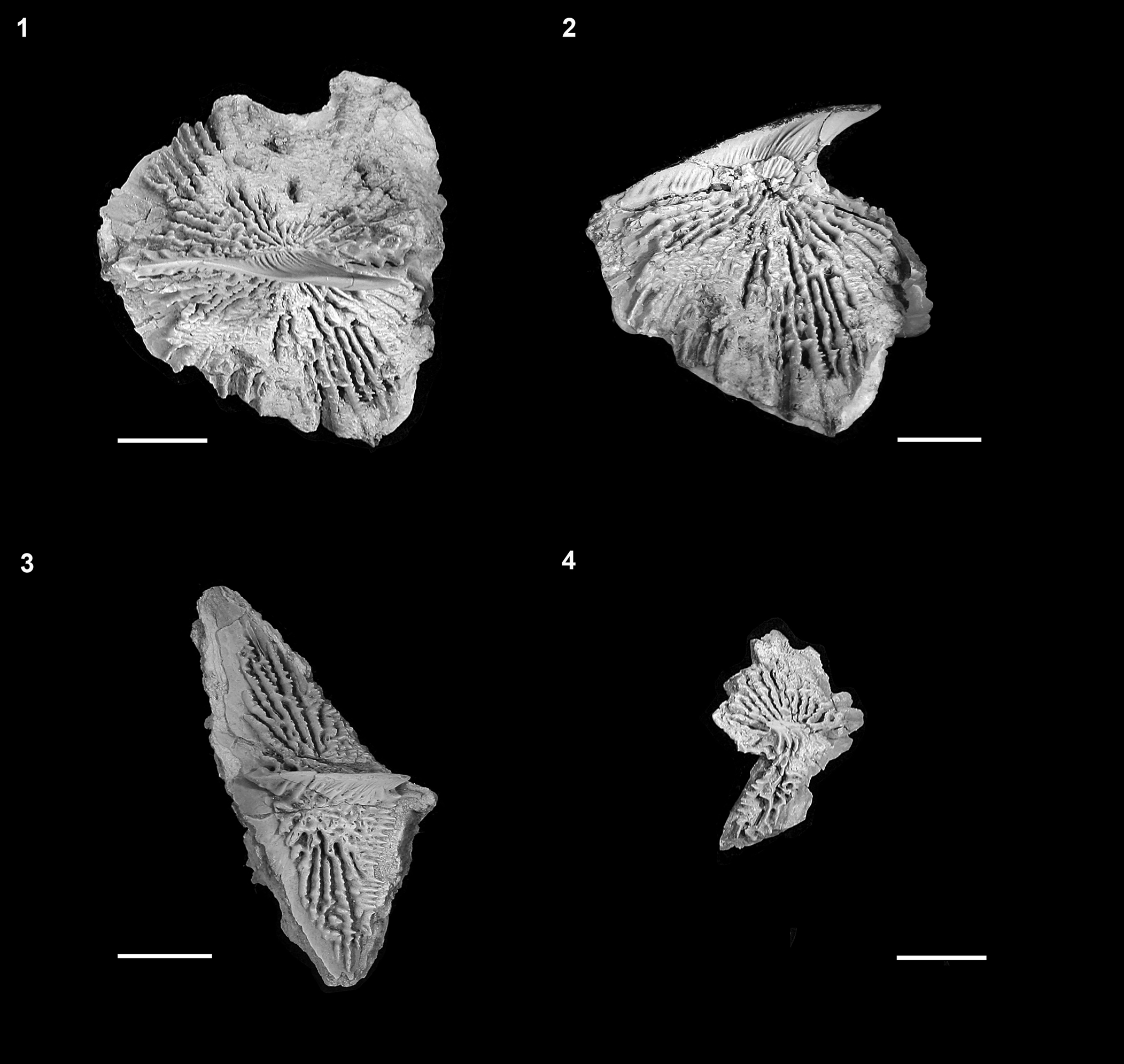 Figure 17. †Acipenser praeparatorum n. sp., isolated body scutes. (1) Dorsal and (2) lateral views of isolated dorsal scute (FMNH PF17616); (3) lateral view of lateral scute (FMNH PF17615); (4) lateral view of anterior ventral scute (FMNH PF17617). Anterior facing left. Scale bars = 1 cm.