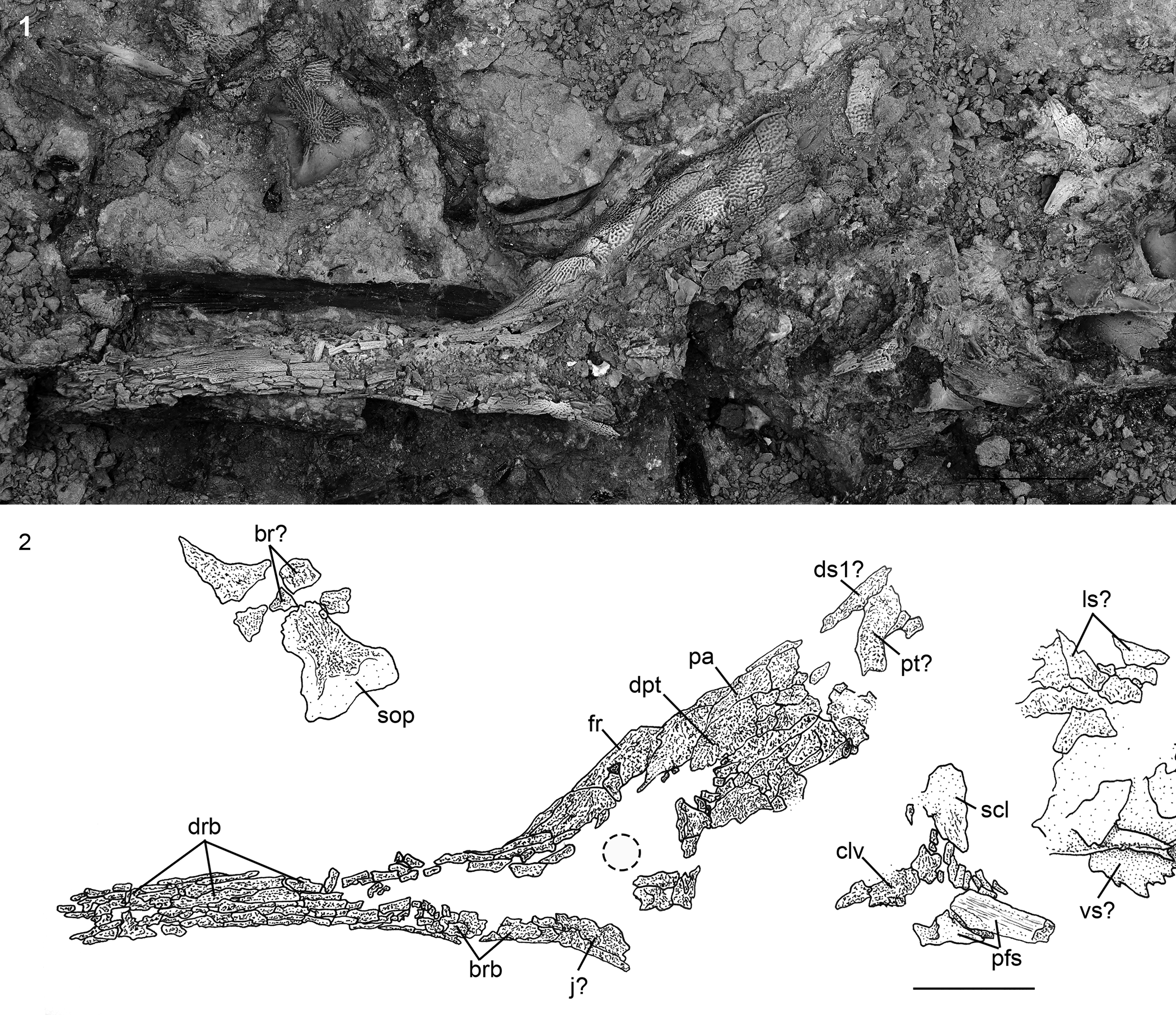 The skull bones of the unique specimen are crushed and few details of the sutures and relationships among different elements can be discerned. Elements that are preserved include the frontals, parietals, dermopterotics, and possibly the jugal, the first dorsal scute, and the posttemporal, but none can be described (Fig. 18). Anteriorly, the snout is covered by elongate, narrow dorsal rostral bones and border rostral bones (Figs. 18, 19). The snout is long (preorbital length is ~200 mm) and is 57% of the estimated head length.