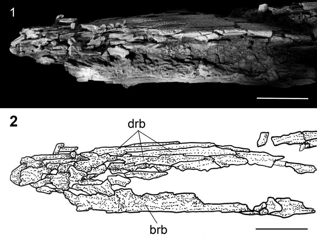 Figure 19. †Acipenser amnisinferos n. sp. (FMNH PF17629, holotype), anterior tip of rostrum in ventrolateral view. (1) Photograph and (2) line drawing. Anterior facing left. Scale bars = 2 cm. Abbreviations: brb, border rostral bones; drb, dorsal rostral bone.