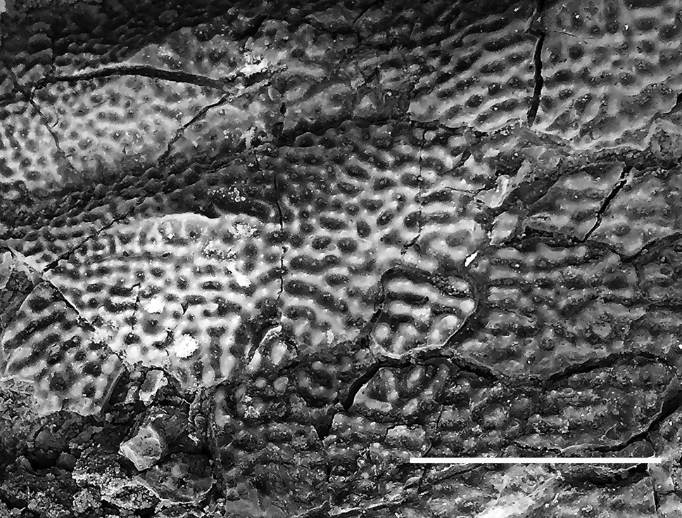 Figure 3. Close up of skull roof of †Acipenser praeparatorum n. sp. (FMNH PF17609) paratype showing detail of the ornamentation of the dermal bones. Scale bar = 5 cm.