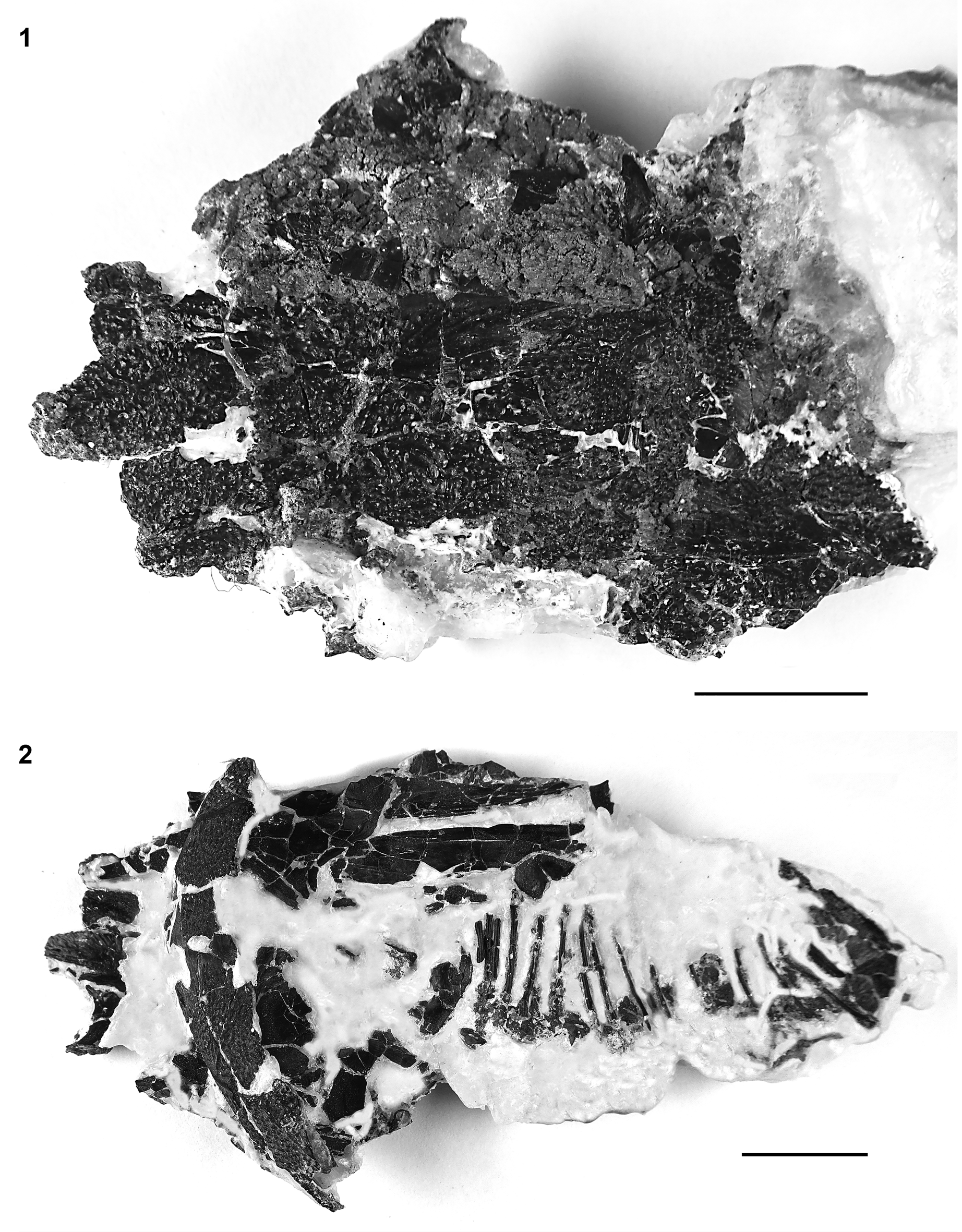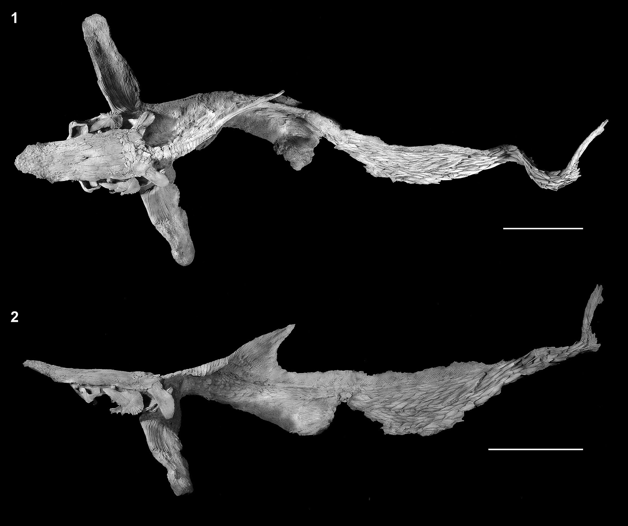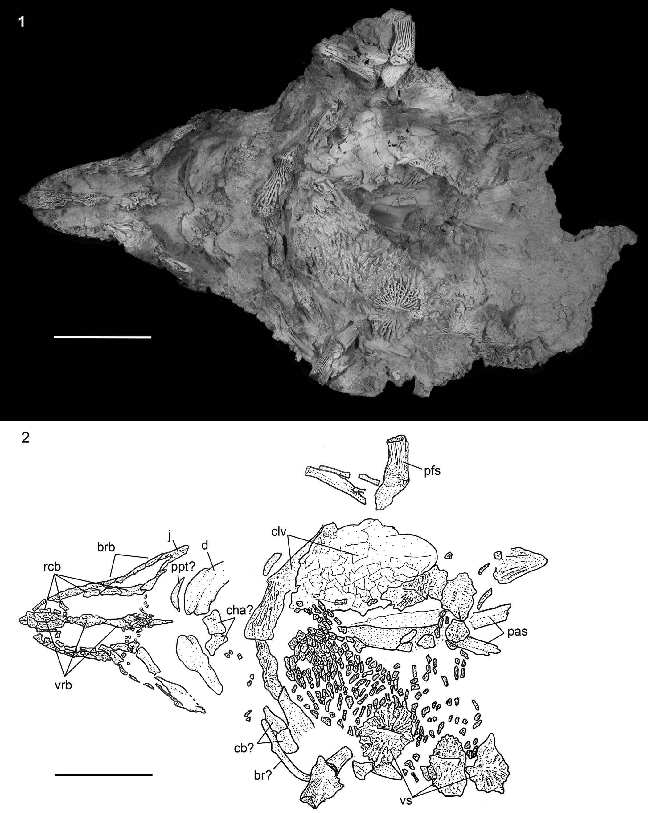 Figure 21. †Acipenser cf. A. amnisinferos n. sp. (FMNH PF17620), skull roof, pectoral girdle, and ribs. (1) Dorsal and (2) ventral views. Anterior facing left. Scale bars = 2 cm.