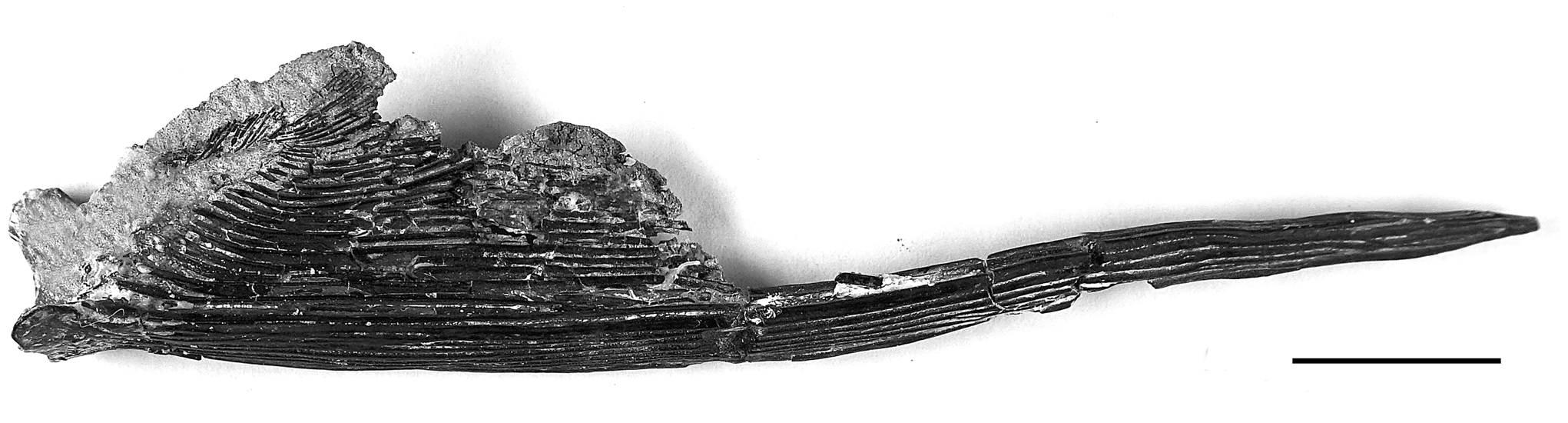 Figure 22. †Acipenser cf. A. amnisinferos n. sp. (FMNH PF17621), pectoral and spine, dorsal view. Anterior facing left. Scale bar = 2 cm.