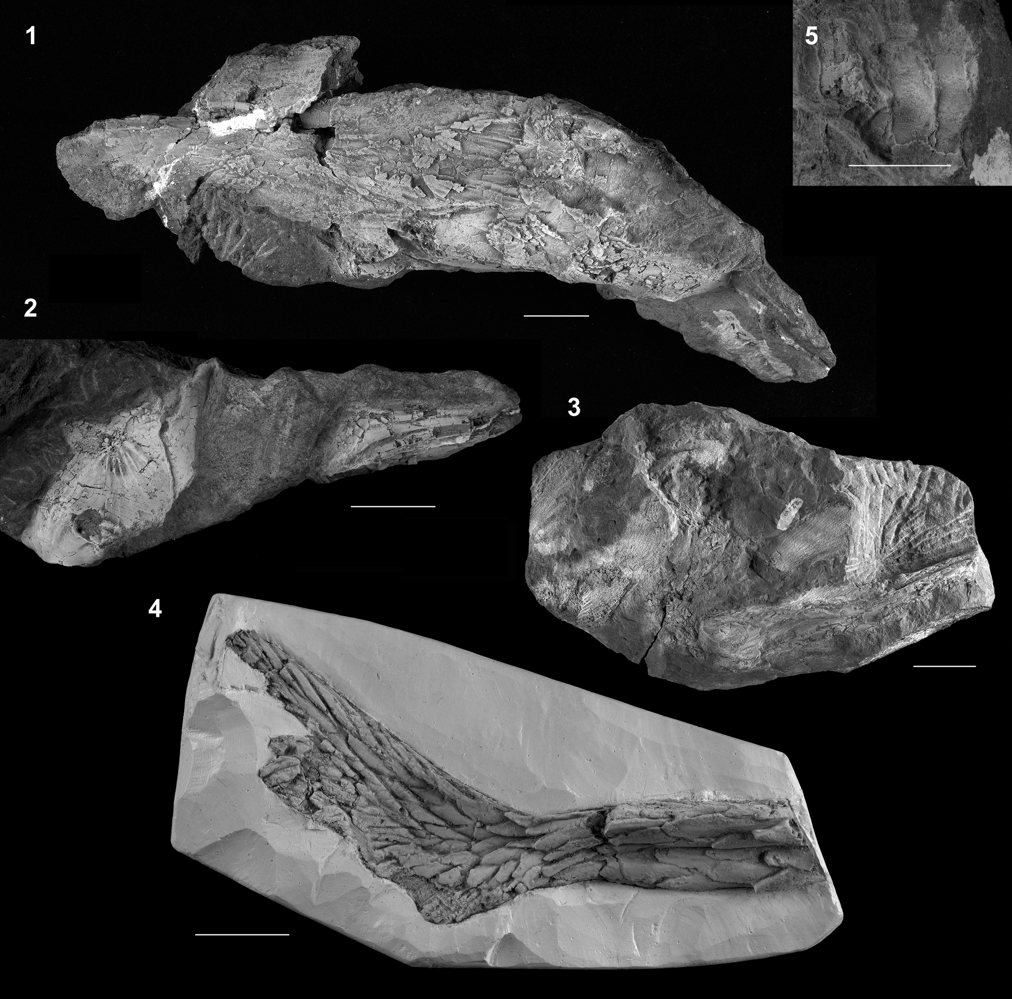 Figure 23. †Protoscaphirhynchus squamosus Wilimovsky, Reference Wilimovsky1956 (UMMP 22210, holotype). (1) Skull roof in dorsal view; anterior facing left; (2) dorsal scutes; anterior facing left; (3) other side of the block with the skull roof, showing the ventral surface of the left clavicle and the proximal portion of the left fin spine; anterior facing left; (4) posterior portion of body and portions of paired fins; (5) cast of the caudal fin, anterior facing right. Scale bars = 2 cm (1–3, 5) and 5 cm (4). Modified from Hilton and Grande (Reference Hilton and Grande2006, figs. 1, 2).