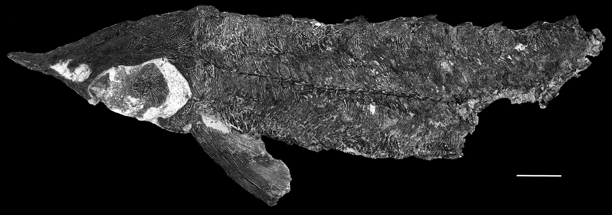 Figure 25. †Anchiacipenser acanthaspis Sato et al., Reference Sato, Murray, Vernygora and Currie2018, UALVP 56596, holotype. Anterior facing left. Scale bar = 5 cm. Photo courtesy of Alison Murray.