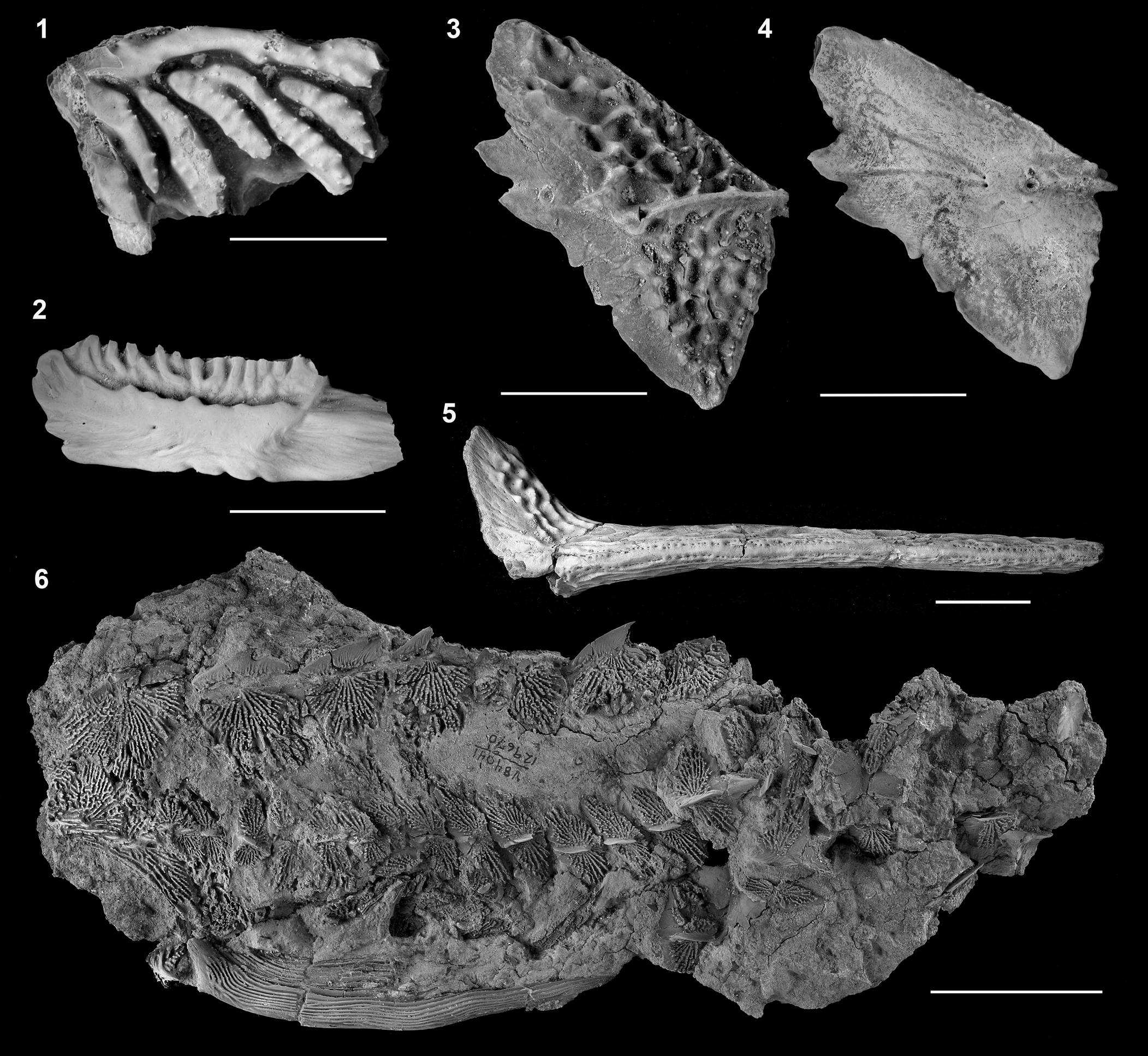 Figure 27. Acipenseridae indeterminate from Hell Creek Formation. (1) †Acipenser eruciferus (Cope, Reference Cope1876), holotype (AMNH 7081); external view, orientation uncertain. (2) †Ceratodus hieroglyphus Cope, Reference Cope1876, holotype (AMNH 7080); considered also to be †A. eruciferus by Estes (1964); view and orientation uncertain. (3) Isolated lateral scute in lateral view (image reversed so that anterior facing left) and (4) medial view. (5) Isolated pectoral fin spine (UCMP 115962). (6) Pectoral girdle and anterior portion of the trunk (UCMP 129670), referred to †Anchiacipenser acanthaspis by Sato et al. (Reference Sato, Murray, Vernygora and Currie2018). Modified from Hilton and Grande (Reference Hilton and Grande2006, figs. 4, 6). Anterior facing left unless otherwise noted. Scale bars = 5 mm (1, 2), 2 cm (3–5), and 5 cm (6).