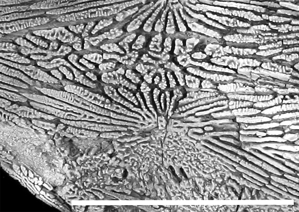 The ornamentation of the dermal bones, including those forming the skull roof, pectoral girdle, and scutes, is formed by well-defined ridges that radiate from a presumed center of ossification (Fig. 3). Some of the ridges anastomose, but they do not form networks of cells, as many other acipenserids do (e.g., Acipenser oxyrinchus Mitchill, Reference Mitchill1815). The ridges also form deep channels, as seen in some other members of the family (EJH, personal observation). Element-specific variations in the ornamentation are described below.
