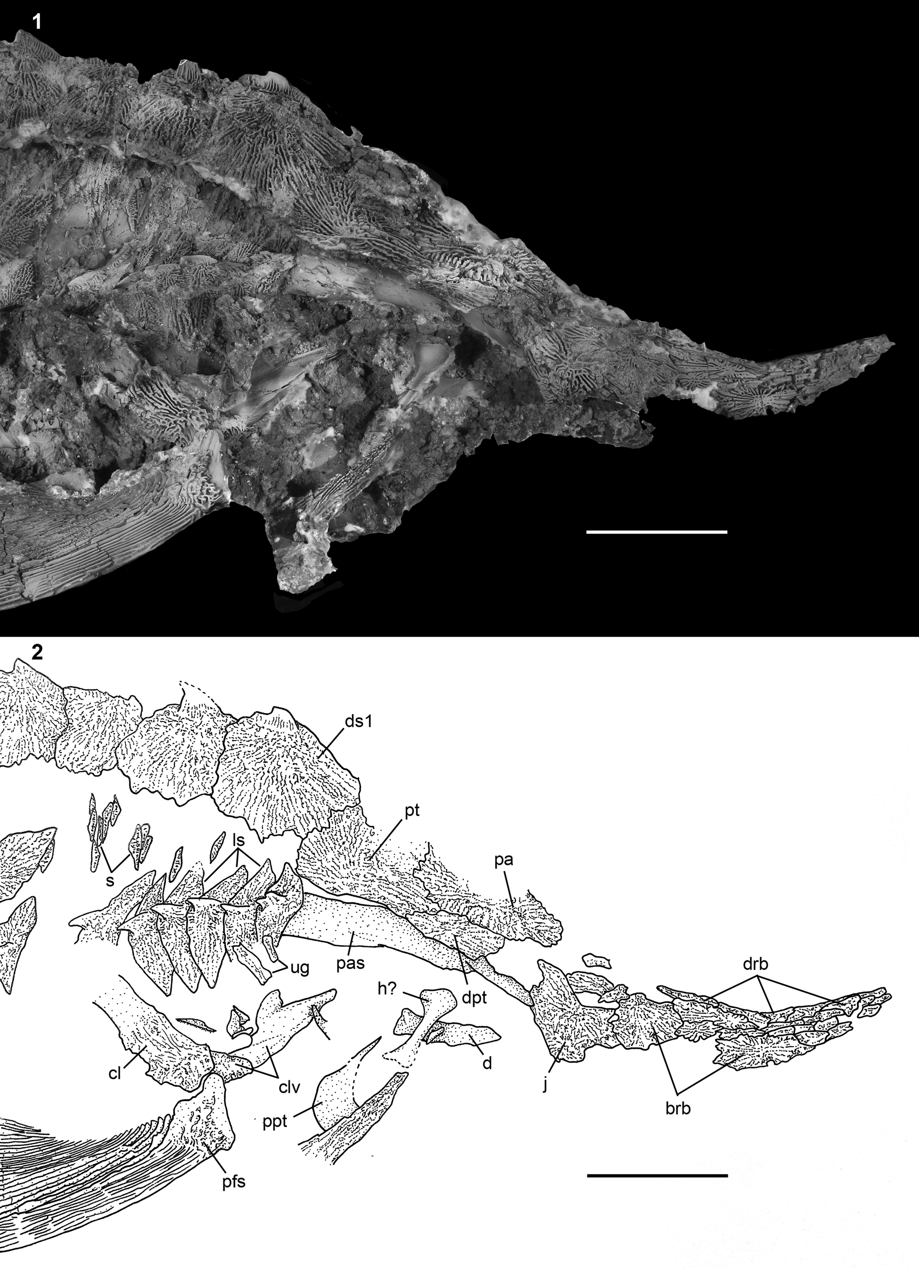 Figure 5. †Acipenser praeparatorum n. sp. (FMNH PF17607), skull in lateral view. (1) Photograph and (2) line drawing. Anterior facing right. Abbreviations: brb, border rostral bones; cl, cleithrum; clv, clavicle; d, dentary; dpt, dermopterotic; drb, dorsal rostral bone; ds1, first dorsal scute; h, hyomandibula; j, jugal; ls, lateral scute; pa, parietal; pas, parasphenoid; pfs, pectoral-fin spine; ppt, palatopterygoid; pt, posttemporal; s, body scales (dermal bony plates between scutes); ug, unidentified gill arch bone. Scale bars = 5 cm.