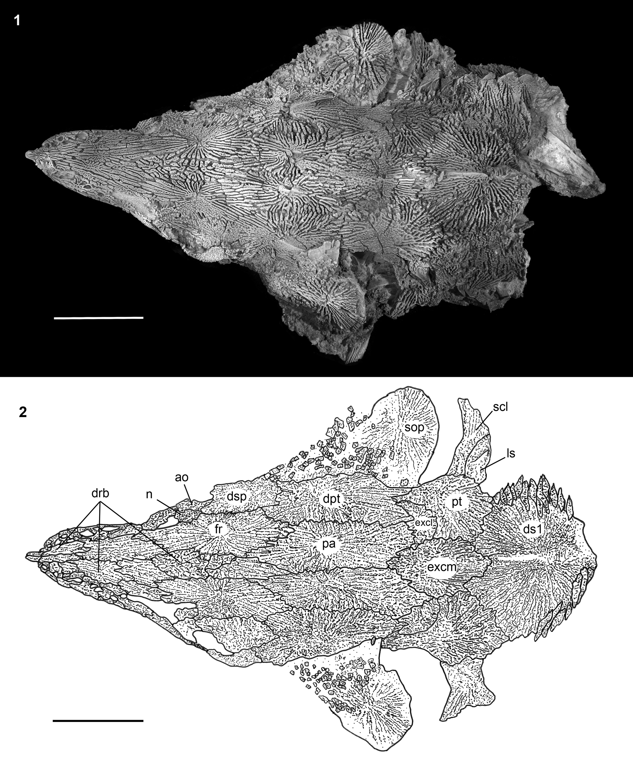 Figure 6. †Acipenser praeparatorum n. sp. (FMNH PF17609), paratype skull in dorsal view. (1) Photograph and (2) line drawing. Anterior facing left. Abbreviations: ao, antorbital; dpt, dermopterotic; drb, dorsal rostral bone; ds1, first dorsal scute; dsp, dermosphenotic; excl, lateral extrascapular; excm, median extrascapular; fr, frontal; ls, lateral scute; n, nasal; pa, parietal; pt, posttemporal; scl, supracleithrum; sop, subopercle. Scale bars = 5 cm.