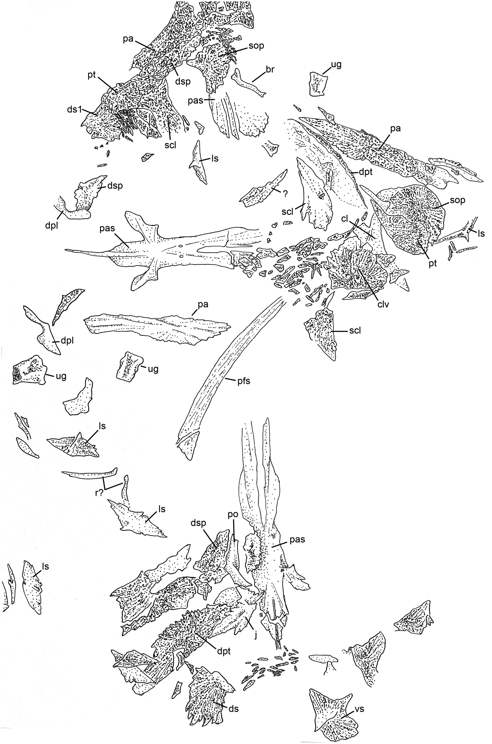 Figure 9. Line drawing of Figure 3. Abbreviations: br, branchiostegal; cl, cleithrum; clv, clavicle; dpl, dermopalatine; dpt, dermopterotic; ds, dorsal scute; ds1, first dorsal scute; dsp, dermosphenotic; j, jugal; ls, lateral scute; pa, parietal; pas, parasphenoid; pfs, pectoral-fin spine; po, postorbital; pt, posttemporal; r, rib; scl, supracleithrum; sop, subopercle; ug, unidentified gill arch bone; vs, ventral scute. Scale bar = 5 cm.