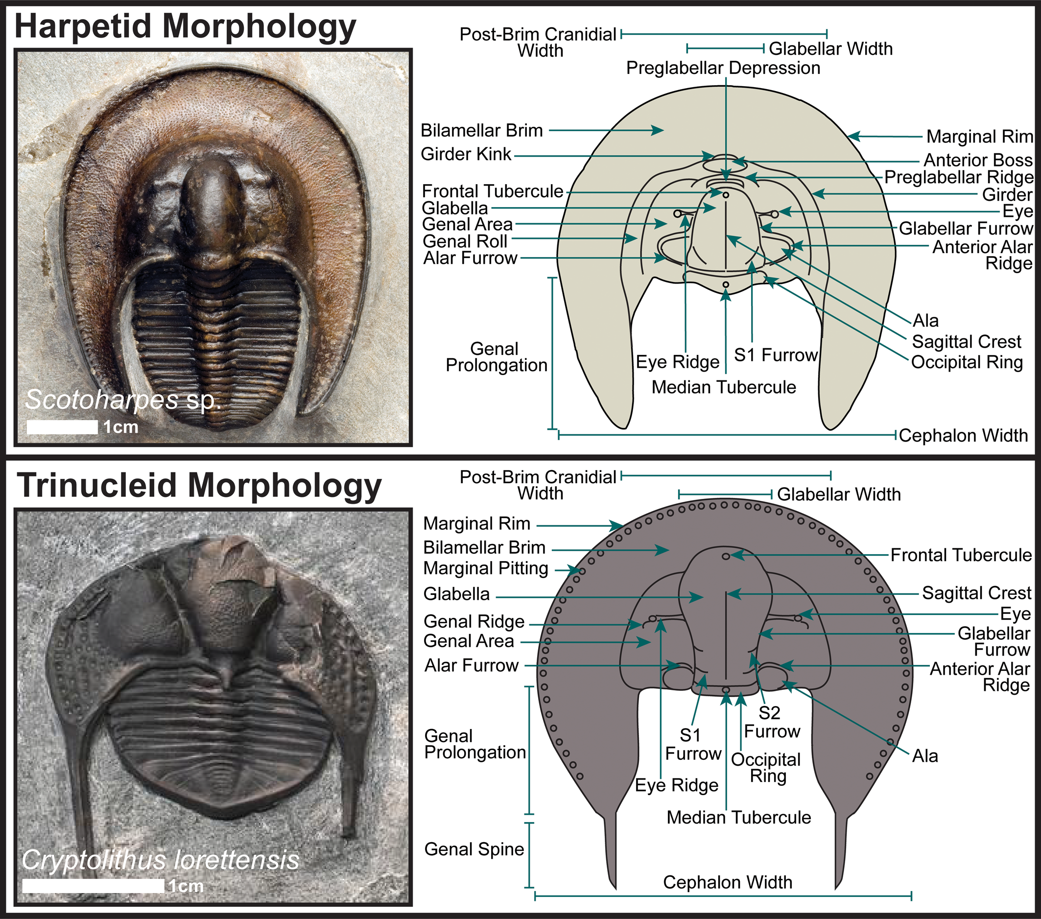 Figure 1. General dorsal cephalic morphology of harpetid and trinucleid trilobites. Adapted from Beech and Lamsdell (Reference Beech and Lamsdell2021).
