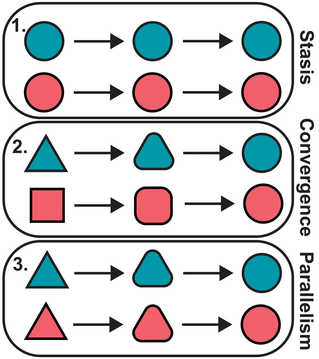 Figure 2. Alternative scenarios explaining morphological similarity: evolutionary stasis following divergence from a common ancestor (1), convergent evolution (2), and parallel evolution (3). The different colors are used to denote distinct evolutionary lineages. The different shapes indicate different phenotypes/morphotypes.