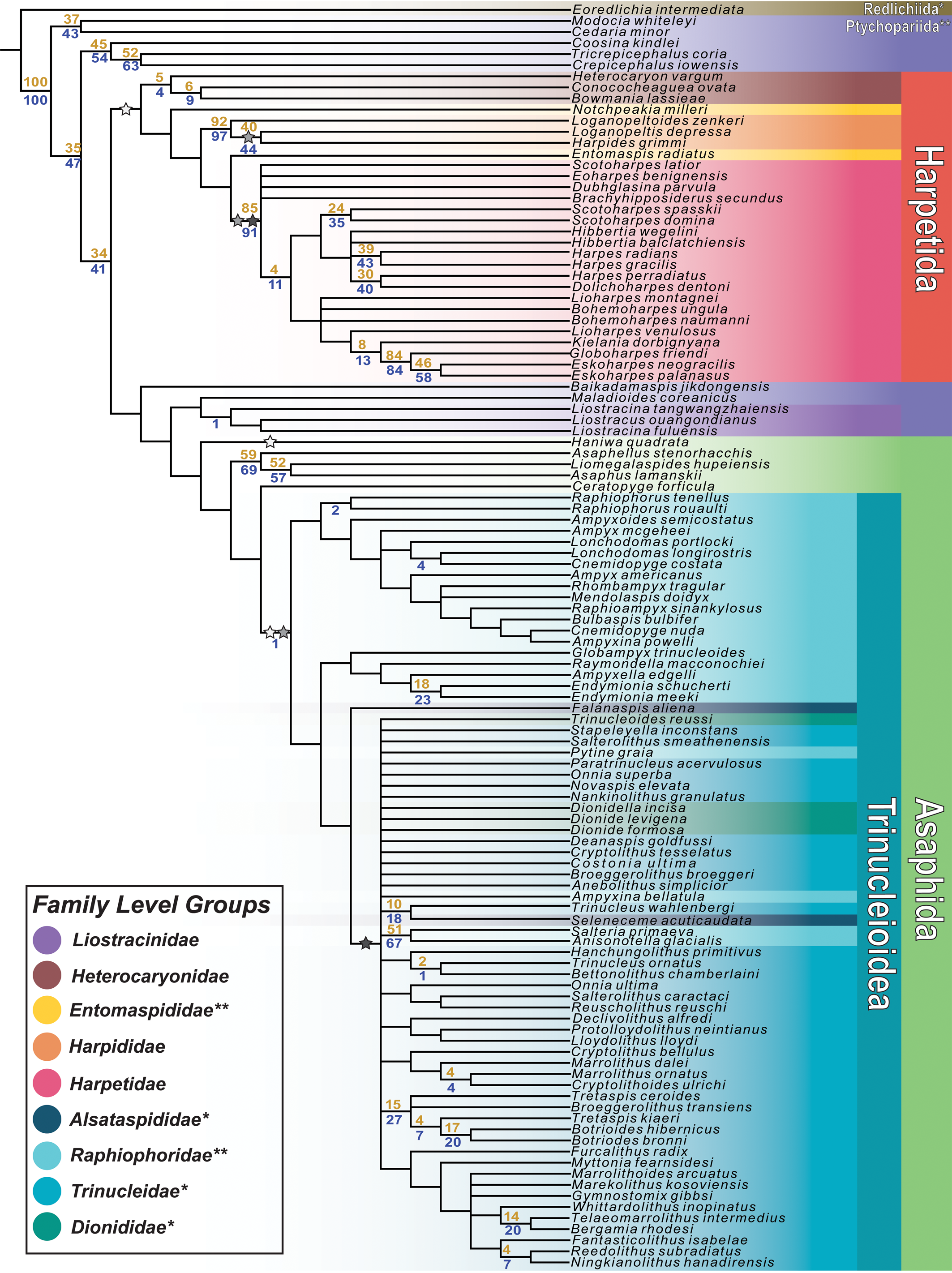 Figure 3. A strict consensus of the 751 most parsimonious trees found by TNT. Bootstrap support values of nodes are shown in gold, jackknife support values in blue. Stars indicate the appearance of characters important to the evolution of the harpiform brim. White stars correspond to yoked librigenae, gray stars correspond to marginal facial sutures, and black stars correspond to the harpiform brim itself. Secondary losses of these characters are not indicated. The colors shown in the legend are used to designate different taxonomic groups of trilobites. Groups whose names are marked with * in the legend are shown to be actually or potentially paraphyletic. Groups marked with ** in the legend are shown to be polyphyletic.