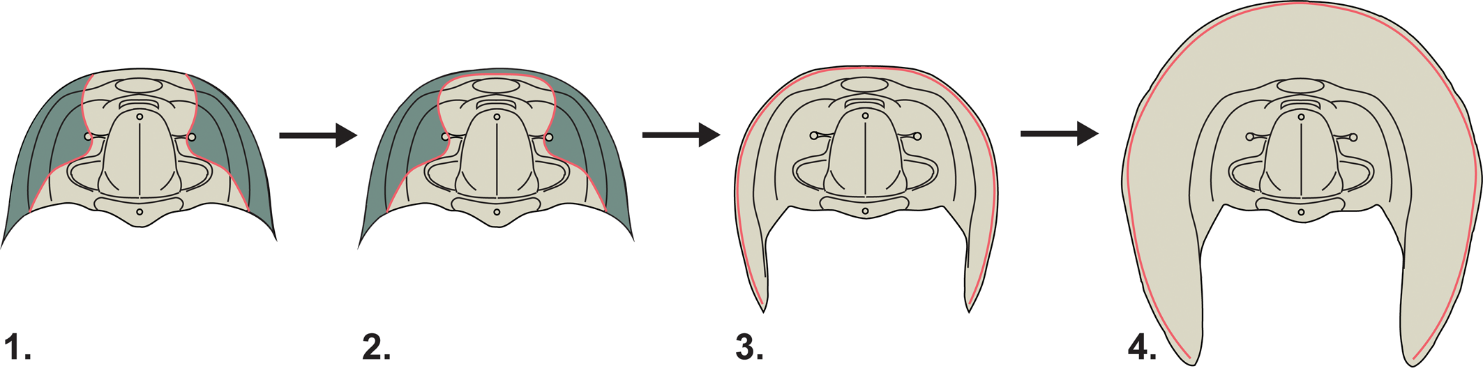 Figure 4. Inferred evolutionary sequence leading to the development of the harpiform brim. The cephalons figured here in dorsal view represent idealized morphotypes rather than specific taxa. The facial sutures are highlighted in red and the librigenae (free cheeks) in green. (1) An ancestral morphology with ptychopariid-like facial sutures and unyoked librigenae. (2) The librigenae become connected by a “yoke” running parallel to the cephalic margin. (3) The facial suture migrates to the outer margin of the cephalon. (4) The development of a wide, flattened bilamellar brim.