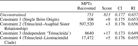 In our second constraint analysis we constrained Trincleioidea to appear as sister-taxon to a monophyletic Asaphida, rather than falling within it (Constraint 2). Under Constraint 2, we found 507,520 most parsimonious trees, with a tree length of 816 (three steps longer than the unconstrained MPTs), a consistency index of 0.176, and a retention index of 0.656. The consensus of these trees otherwise closely resembles the consensus of our unconstrained MPTs.