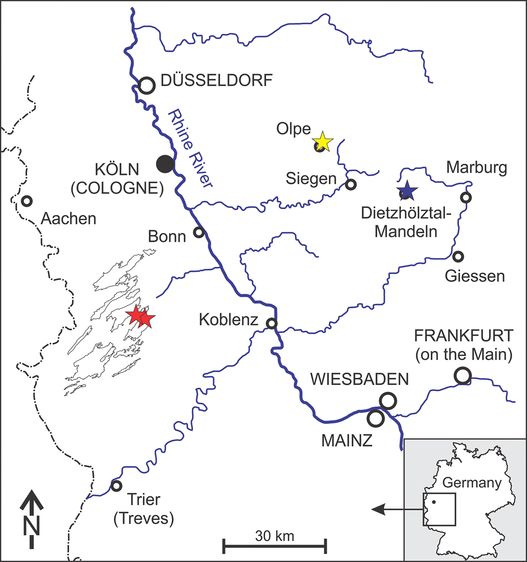 Figure 1. Geographical overview of the Rhenish Massif (modified from Korn, Reference Korn2008, after Walter, Reference Walter1995). The German Monstrocrinus localities are marked with stars: red stars mark the sites within the Eifel synclines (“Eschfelder Seifen,” in the west, and northern Ahbach Valley, in the east); the yellow star indicates the fossil locality in the Sauerland (former brick factory in the Osterbachtal); and the blue star marks the fossil site within the Lahn–Dill district (“Old Municipality Quarry” in Dietzhölztal–Mandeln).